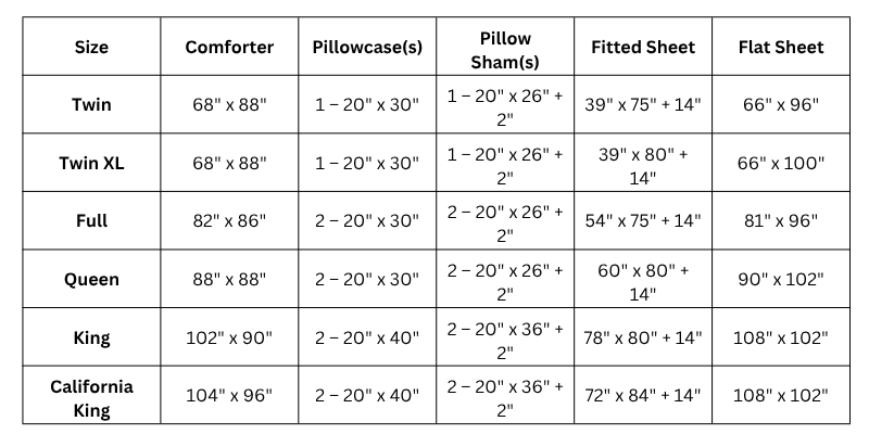 - Queen Set: The quintessential set for queen beds, with 1 Comforter (88" x 88"), 2 Pillowcases (20" x 30"), 2 Pillow Shams (20" x 26" + 2"), 1 Fitted Sheet (60" x 80" + 14"), and 1 Flat Sheet (90" x 102").