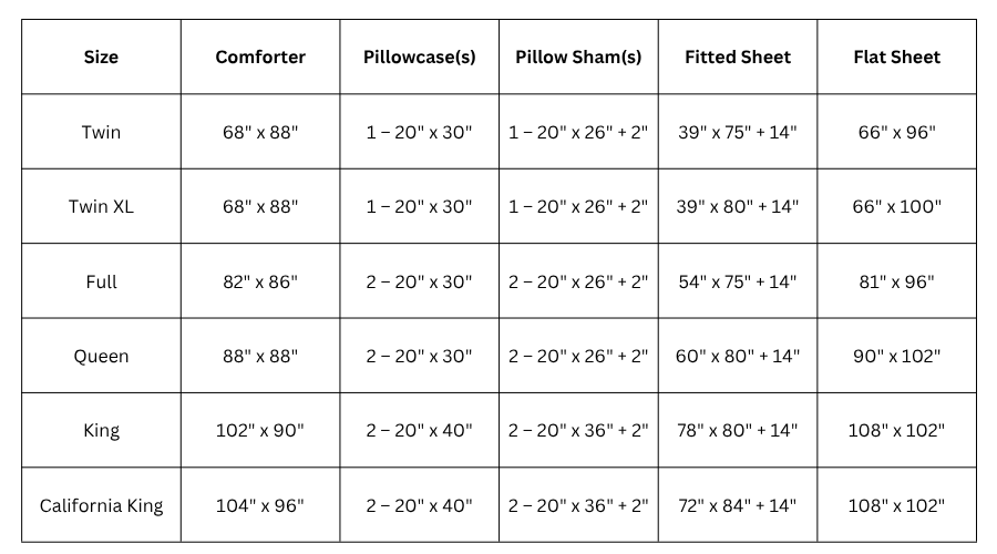 Queen Set: The quintessential set for queen beds, with 1 Comforter (88" x 88"), 2 Pillowcases (20" x 30"), 2 Pillow Shams (20" x 26" + 2"), 1 Fitted Sheet (60" x 80" + 14"), and 1 Flat Sheet (90" x 102").