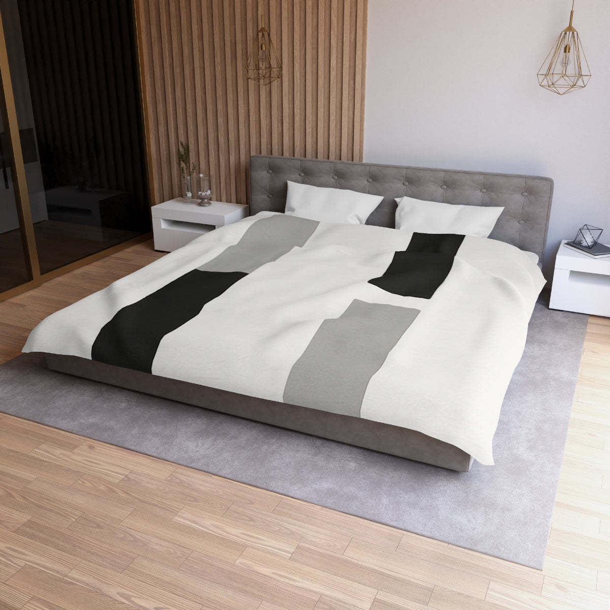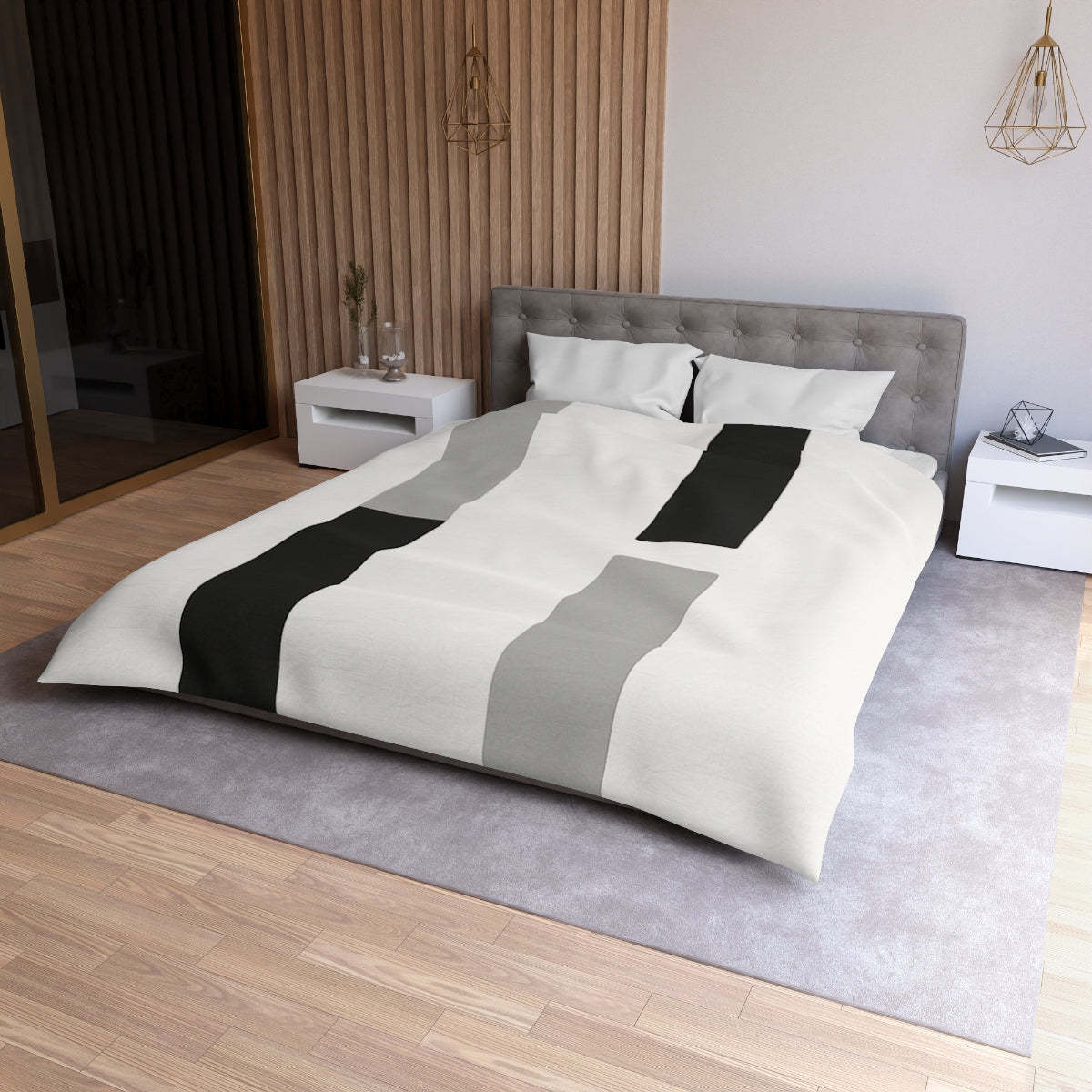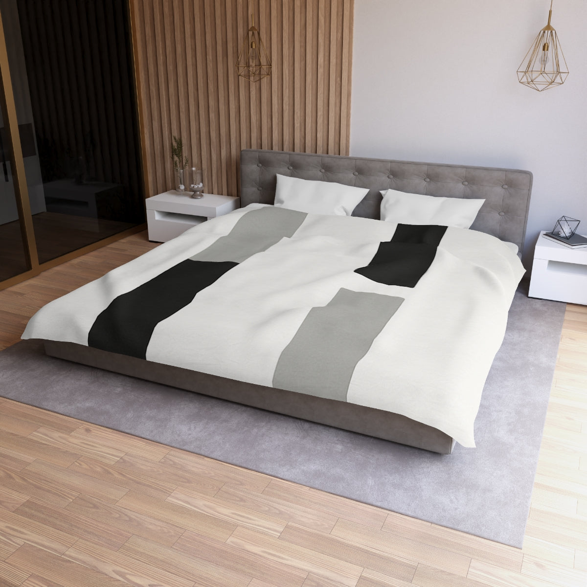 Elevate your bedroom with our striking Minimalist Rectangle Duvet Cover, designed to create a harmonious blend of modern artistry and effortless comfort. This luxurious duvet cover showcases a carefully structured arrangement of slender rectangles that form an engaging yet minimalist grid, featuring subtle variations in height to maintain visual interest. Crafted from premium materials, it offers an ultra-soft feel against your skin, ensuring the utmost comfort for restful nights. The muted gray and deep black palette not only highlights the clean lines of the design but also introduces dynamic tension and balance, making it a stunning focal point in your bedroom decor. Perfect for contemporary bedroom styling, this luxury duvet effortlessly enhances any bedding set while providing a soothing environment for sleep. Plus, it's machine washable and fade-resistant, ensuring long-lasting beauty and durability. Transform your bedroom into a serene sanctuary with this exquisite duvet cover—a perfect gift idea for those who appreciate both style and comfort!