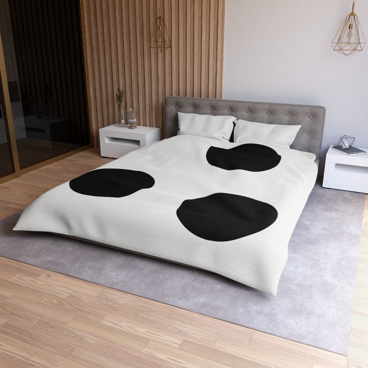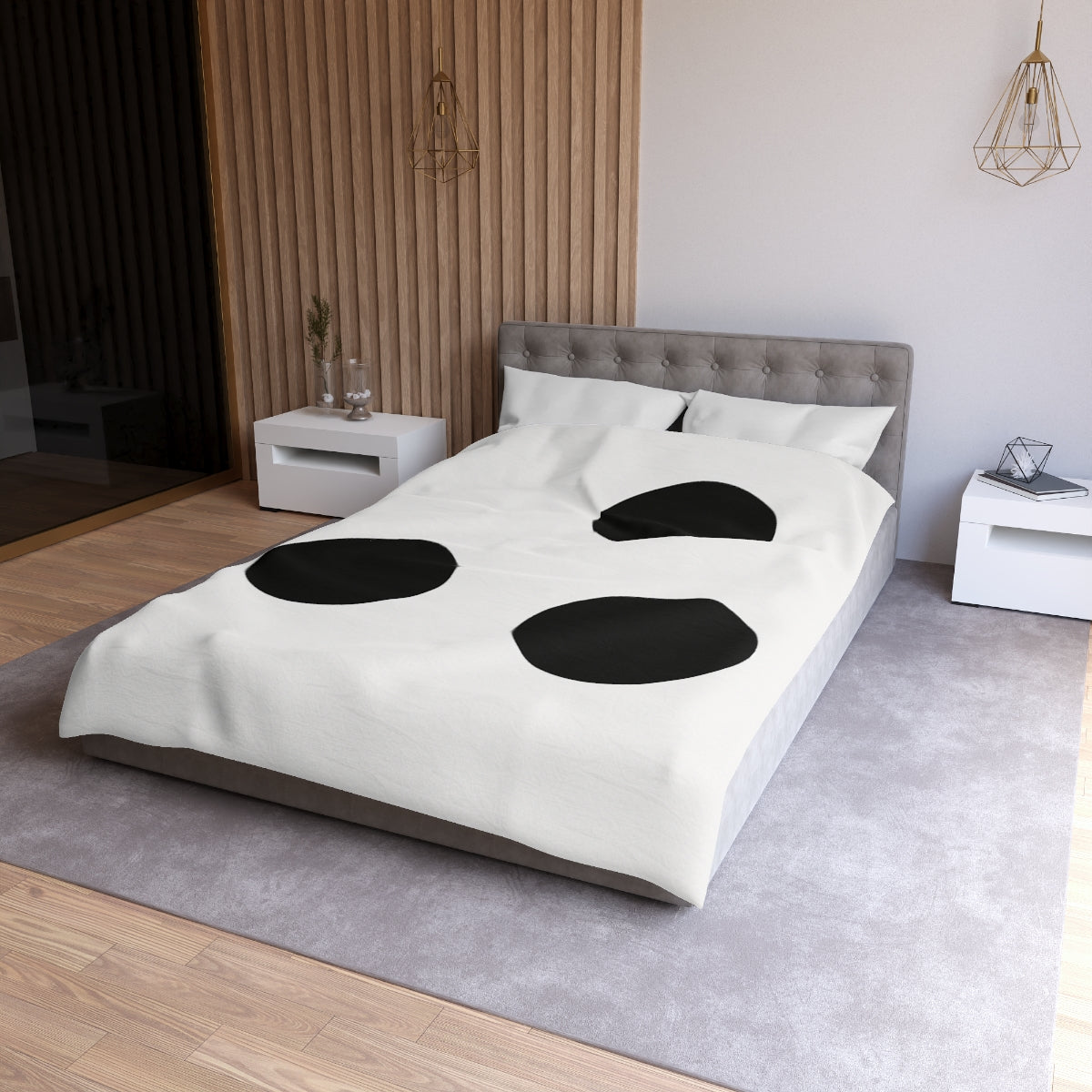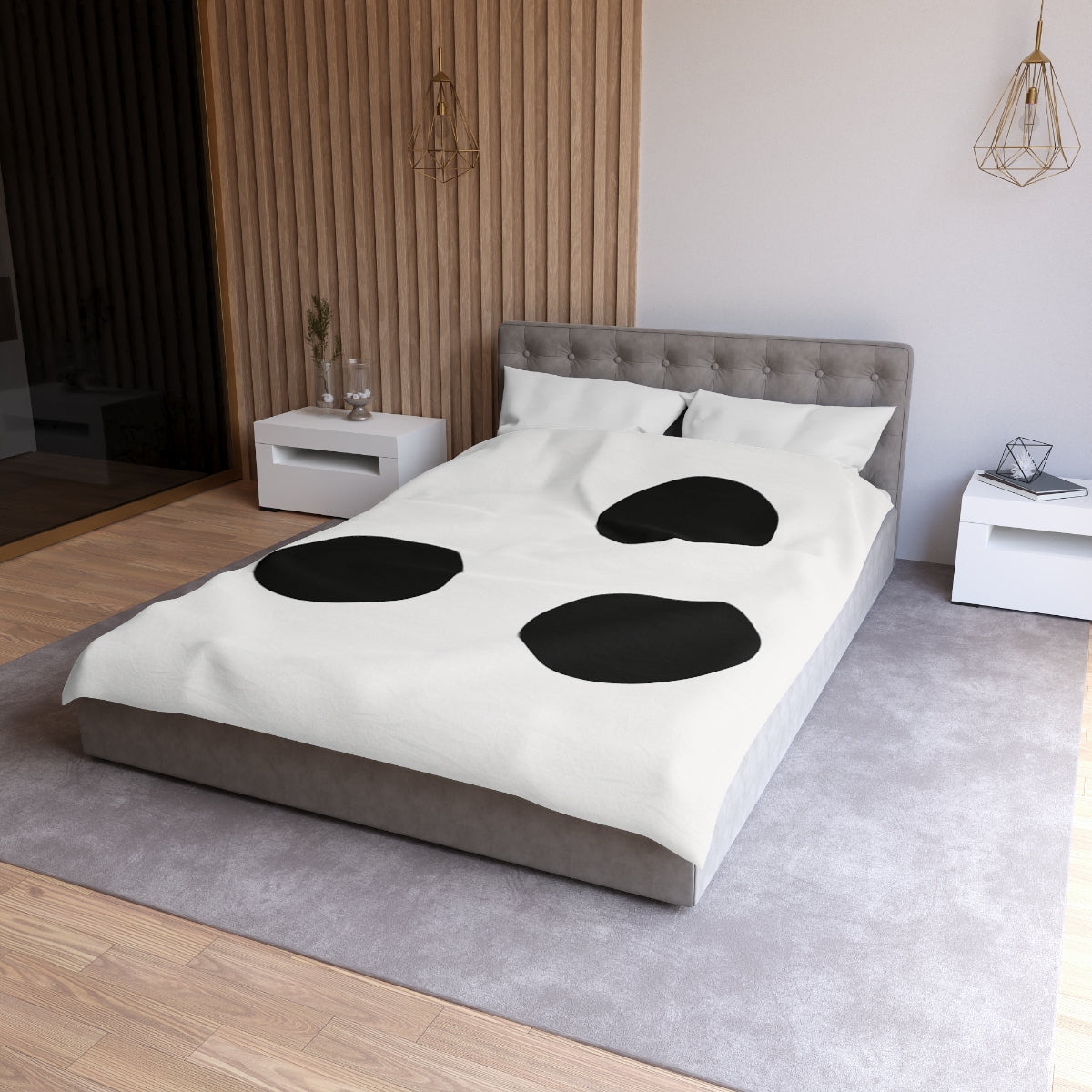 Elevate your bedroom decor with our exquisite minimalist duvet cover, showcasing a captivating design of three elegantly arranged circles. Each circle is crafted to achieve a harmonious balance, offering a serene visual experience that effortlessly blends with your home decor. The uniform size and sophisticated monochrome color palette emphasize simplicity and style, making this luxury duvet a perfect addition to your bedding set. The subtle triangular formation, subtly offset for an inviting asymmetry, creates a gentle rhythm that fosters a sense of calm and contemplation within your space. Made from premium materials, this soft duvet promises unparalleled comfort and breathability for a restful sleep. Plus, its durable, fade-resistant fabric ensures lasting beauty, transforming your bedroom into a tranquil sanctuary. Perfect as a gift idea for anyone looking to enhance their bedroom styling or as a treat for yourself, this duvet cover offers both aesthetic appeal and practical functionality in one stunning package.